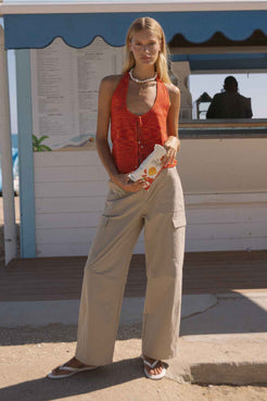 The Emi Halter Top in Coral is a relaxed-fit spacedye knit with an open neckline and front tie details. Cut from 100% recycled rayon viscose, it drapes softly while remaining lightweight and breathable. Designed for effortless resort layering or styled as a set with the Emi Ruched Mini Skirt.