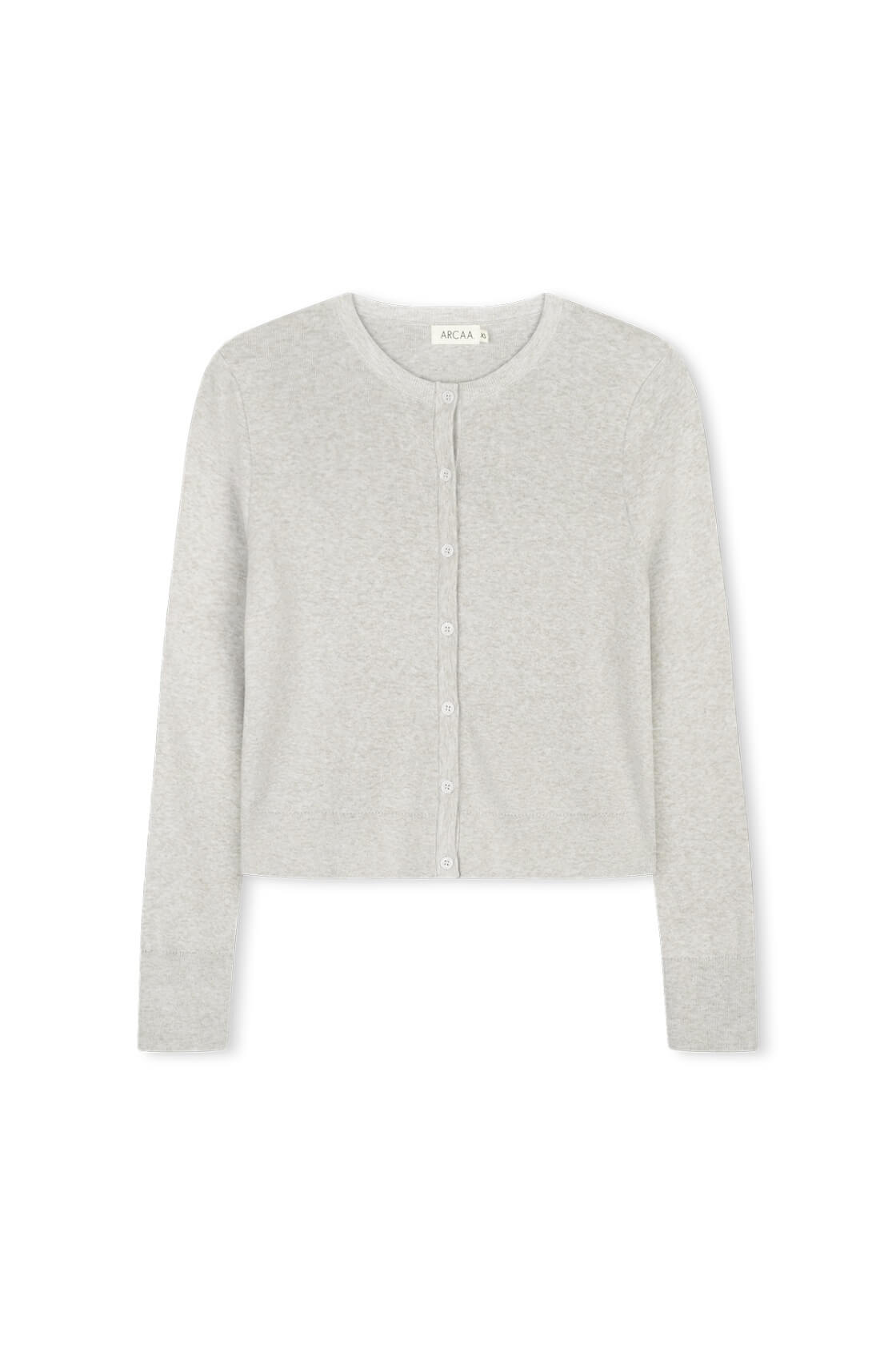 Front view of cropped grey cardigan in smooth organic cotton, crew neckline, and clean button closure.