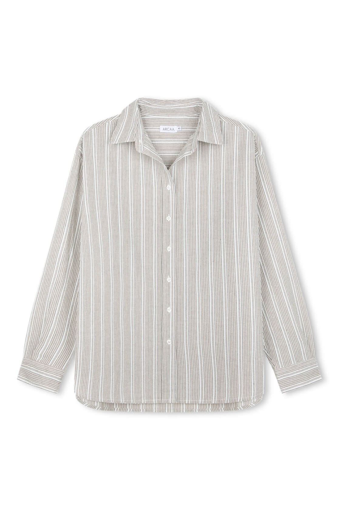 A lightweight cotton shirt with a relaxed, oversized fit inspired by menswear tailoring. The Ines Shirt features a soft textured stripe, dropped shoulder, and deep back pleats for a natural drape. Wear open or buttoned for versatile everyday styling.