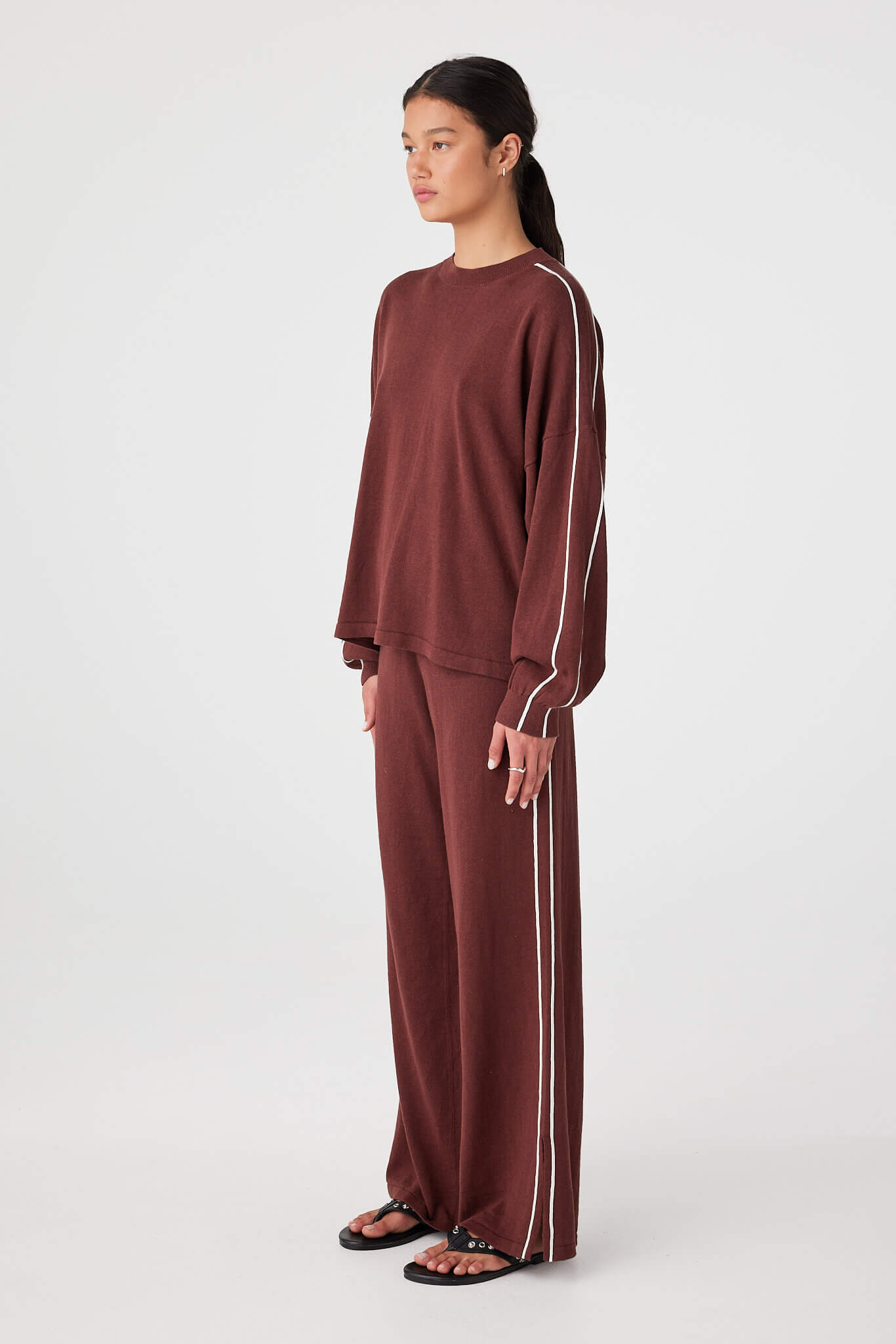 An oversized long sleeve tee in a linen–organic cotton knit that feels dry and breathable in warmth, with a relaxed drape that doesn’t cling. Drop shoulders and contrast stripe detailing create an easy shape for travel days, cool evenings and air-conditioned spaces.