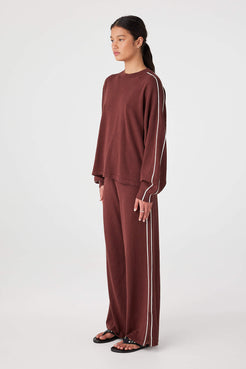 Relaxed wide-leg pants in a lightweight linen–organic cotton blend that feels dry and breathable in warmth and humidity. Ribbed elastic waist and side pleat detailing keep the fit comfortable through sitting and walking, finished with a contrast side stripe for a clean vertical line.