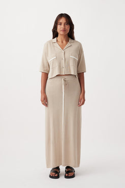 The Quinn Skirt in Taupe features an A-line cut with side splits and a ribbed waistband with a drawcord tie for comfort. It has a contrast stripe detail on the front and is crafted from a 45% organic cotton and 55% linen blend. Ethically produced and OEKO-TEX Standard 100 certified for sustainable, stylish wear.