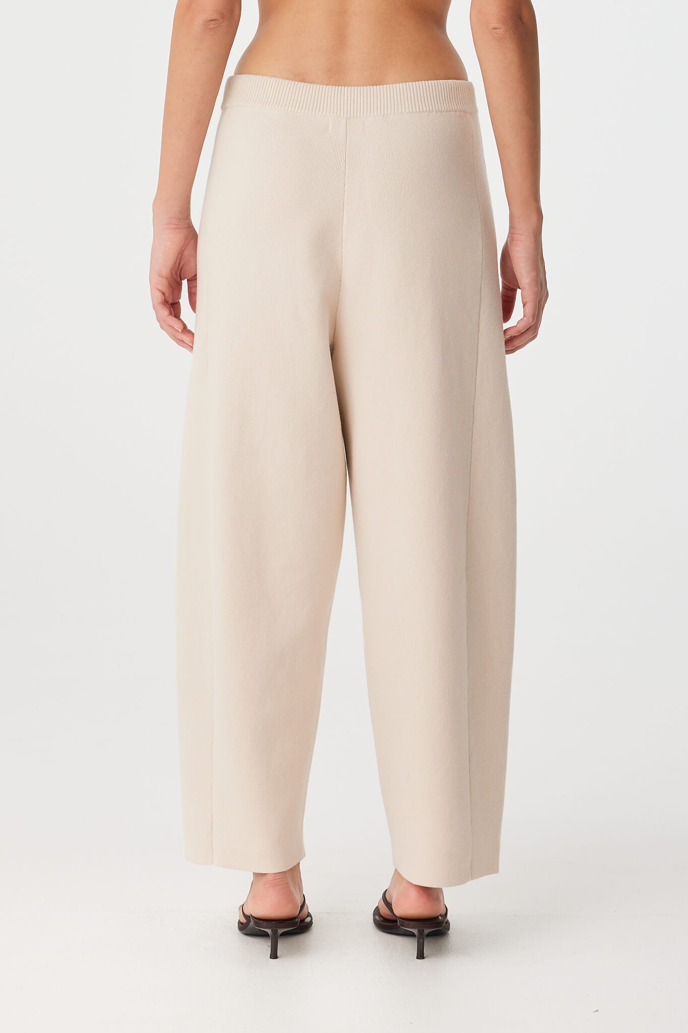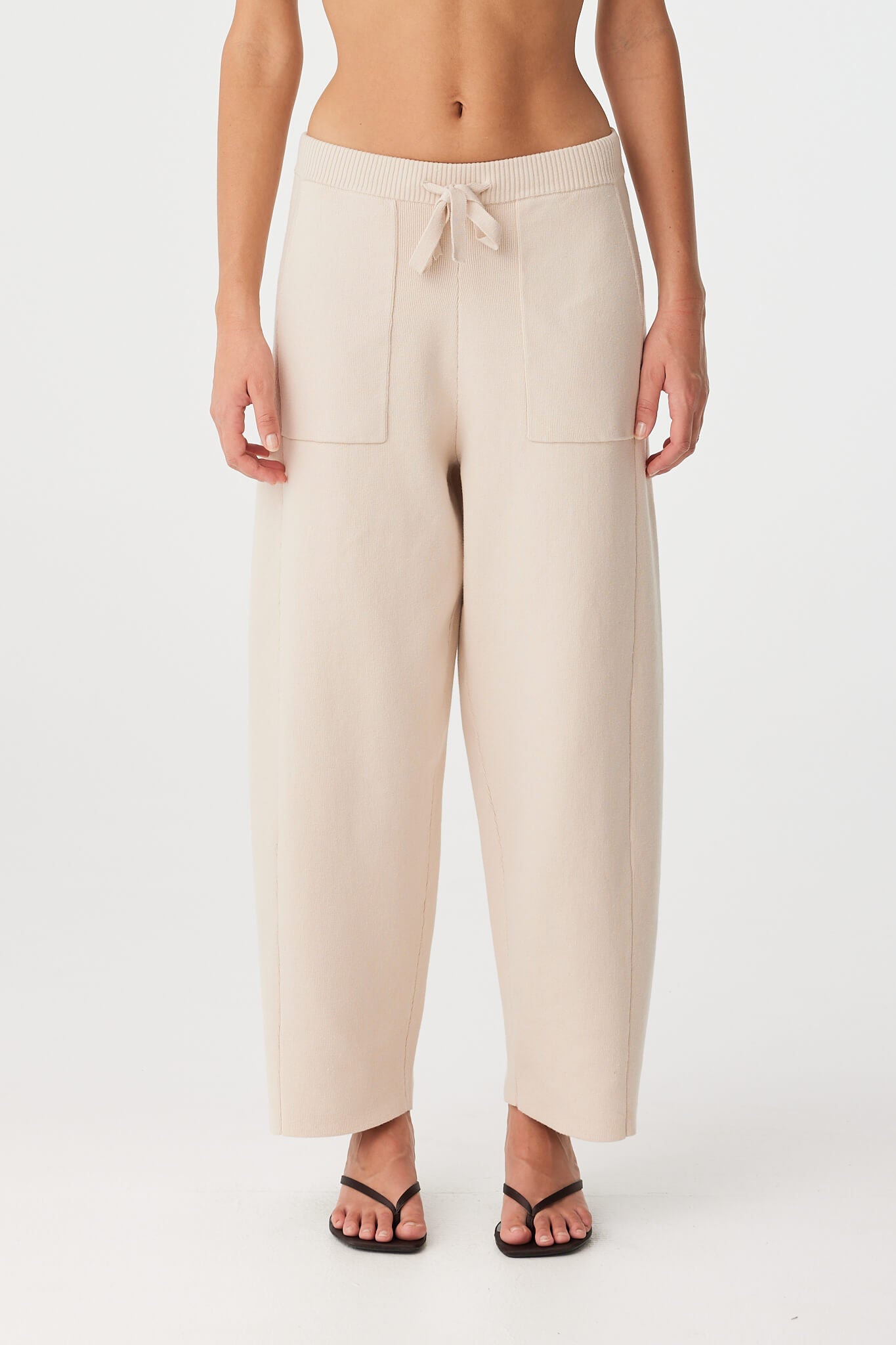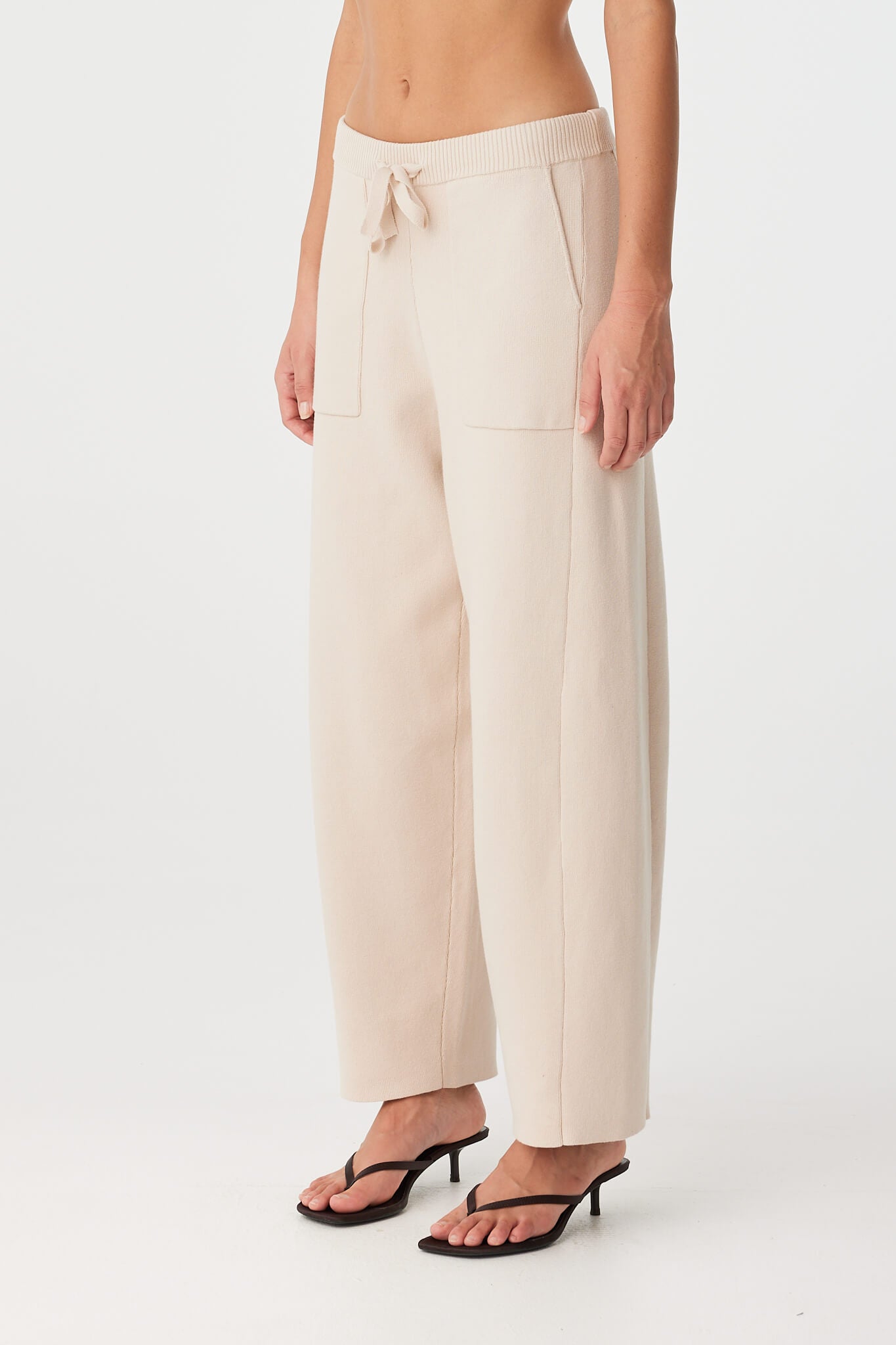 A relaxed knit pant with quiet structure and shape. The Rylan features a soft barrel-leg silhouette, front patch pockets and a drawcord waist for adjustable comfort — wear it high or low rise. Crafted in a breathable organic cotton stretch knit for everyday movement.