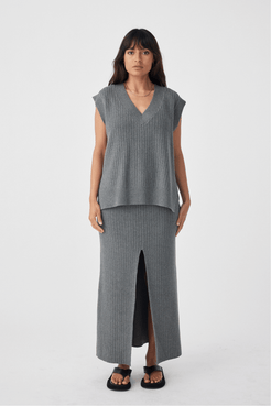 The Vera Organic Knit Vest in Grey Marle offers a timeless vest style with a ribbed V-neck design. Made from 95% orga...