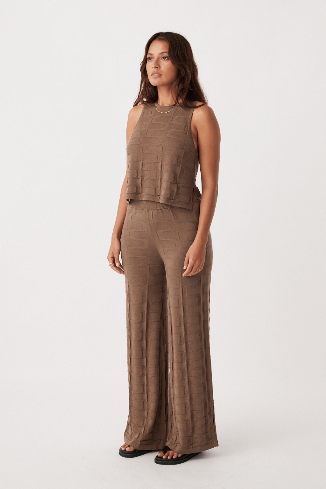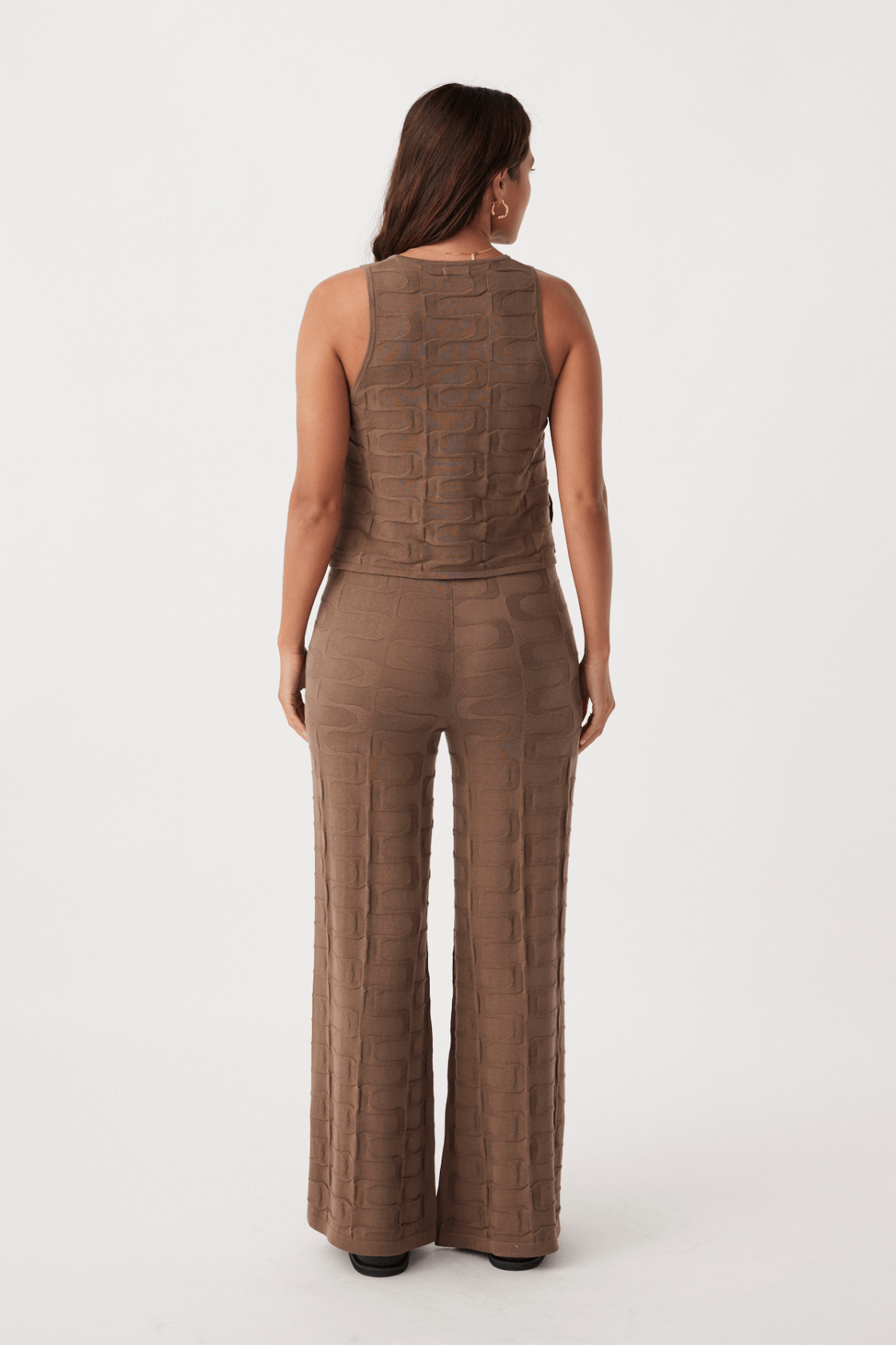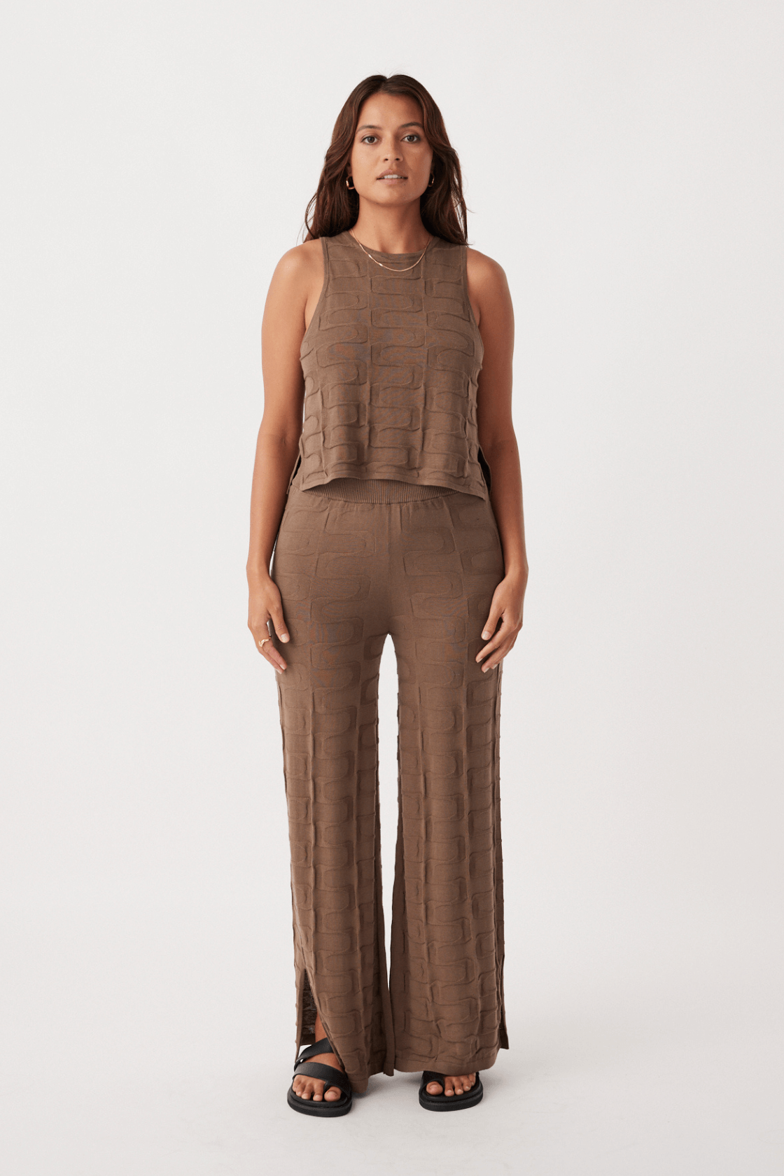 The Lara Organic Cotton Pant in Cacao is designed for comfort and style with its lightweight patterned knit and relaxed wide-leg silhouette. Finished with a ribbed elastic waist and side splits for effortless wear.