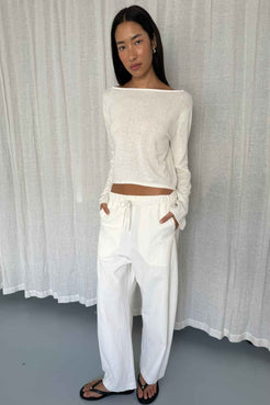 Relaxed barrel‑leg cotton‑linen pants with an elasticated waistband and functional drawstring. Designed for everyday movement with roomy patch pockets and a softly tapered silhouette that moves with you. Breathable and natural, these pants are ideal for warm climates, coastal days, or casual travel wear.