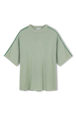 Extra-oversized slouchy tee in a lightweight knit blend of 55% linen and 45% organic cotton. Drop shoulder cut with contrast stripe detailing in eucalyptus and sea green tones. Soft, airy and breathable for warm or humid days, easy to throw on with shorts, pants or over swim.