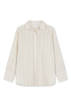 The Rae Shirt in Olive Stripe is an oversized boyfriend-style shirt cut from 100% cotton with a lightweight textured weave. Designed with a classic collar, button-down front, and deep pleats at the back yoke, it creates a relaxed drape and ease of movement. Perfect for layering or worn as a standalone summer staple.