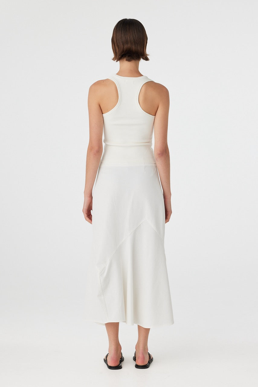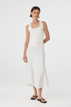 The Alessia Skirt in Cream features an asymmetrical bias-cut hem and a fitted waist with a side-seam zipper. Crafted from a lightweight cotton–Tencel twill, it drapes fluidly with a soft A-line shape that moves naturally with the body.