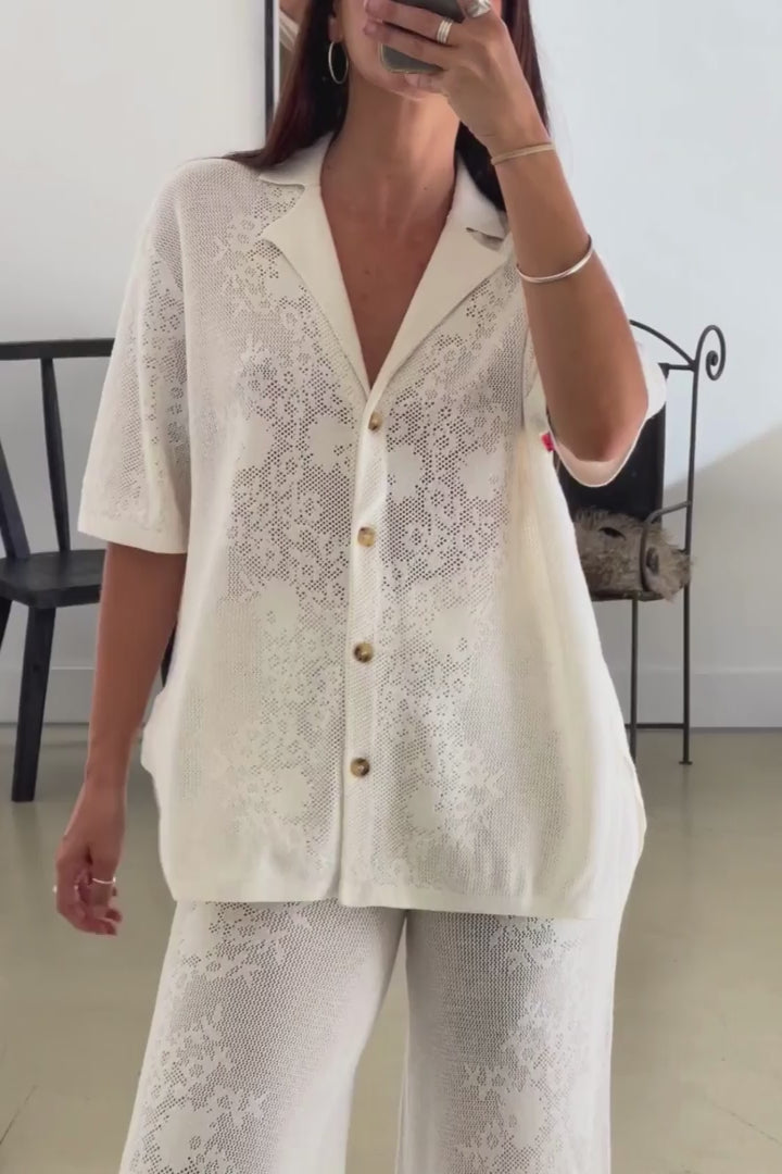 Wide-leg pants in cream crochet styled with matching shirt. Lightweight texture and soft flow ideal for summer layering sets.