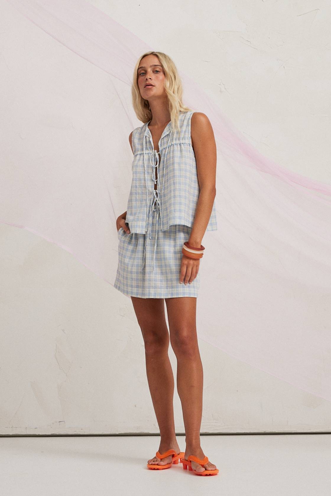 A relaxed cotton blouse with ruched yoke and tie-front closure. Designed in a lightweight check pattern with soft volume and breathable drape for warmer days. Made from 100% cotton.