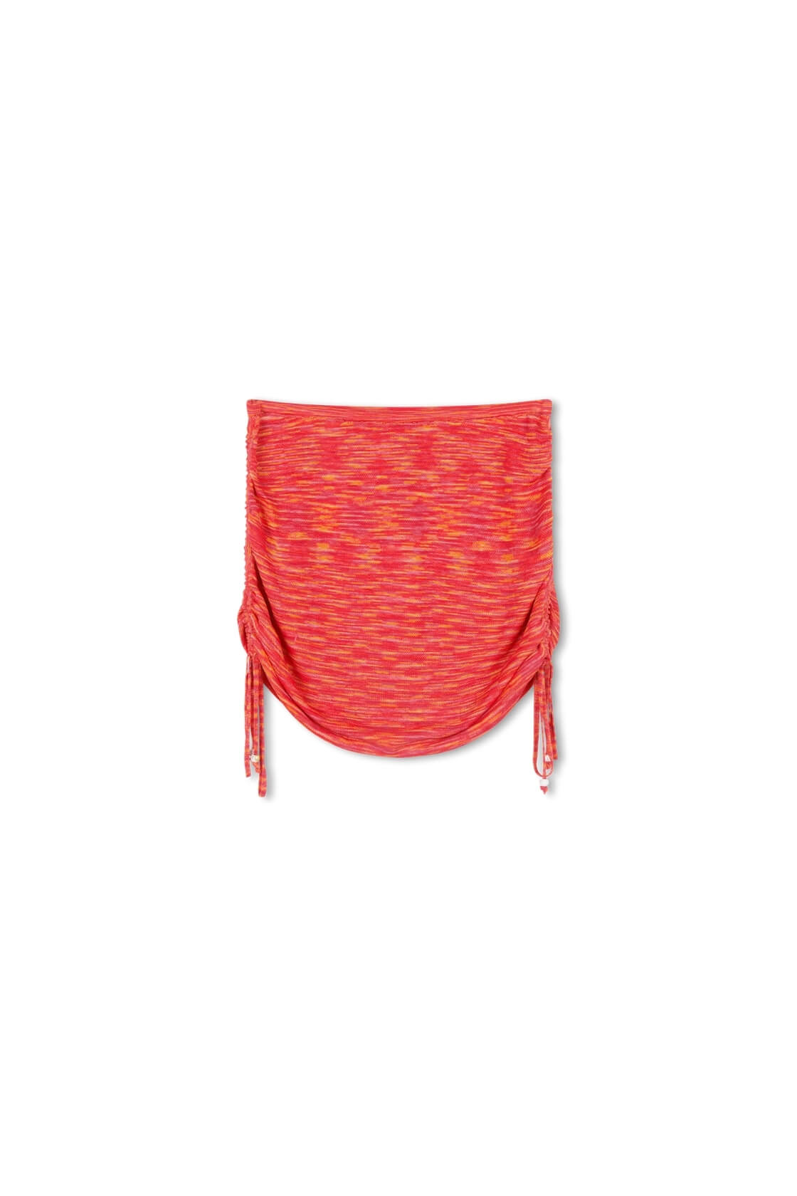 Model wearing coral spacedye halter top with front tie detailing, styled with matching ruched mini skirt.