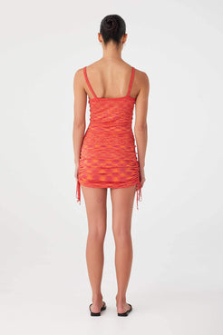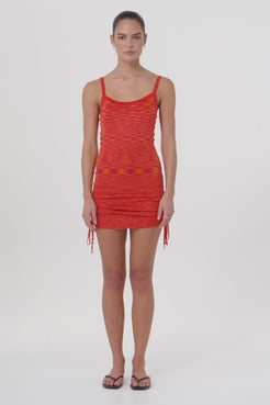 The Emi Mini Dress in Coral is a fitted spacedye knit silhouette with adjustable gathered tie sides for custom length and styling. Cut from 100% recycled rayon viscose, it drapes lightly while remaining breathable, designed for summer ease and elevated resort wear.