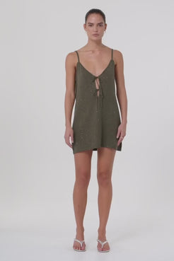A semi-fitted mini dress with subtle shimmer, designed to elevate warm-weather dressing.