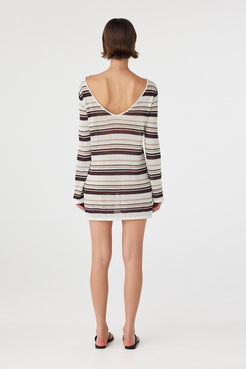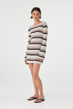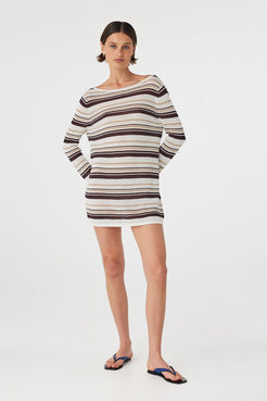 The Nia Long Sleeve Mini Dress in Cream Choc Stripe features a boat neckline and a loose, relaxed fit in a lightweight sheer cotton knit. Designed to layer effortlessly over swim, it’s an elevated beach-to-lunch essential that balances ease and texture.