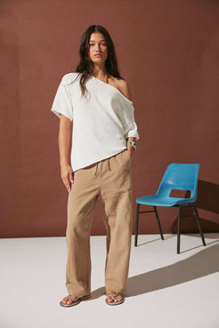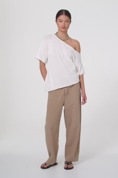 Relaxed barrel-leg pants in a lightweight blend of 55% linen and 45% cotton. Elasticated waistband with drawstring and front and back patch pockets. Naturally breathable and soft for warm or humid days, easy for everyday wear or travel.