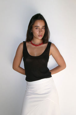 The Nika Tank is a relaxed-fit tank crafted from 100% cotton with a scoop neckline and low-back detail. Its semi-sheer knit texture makes it ideal for layering over swim or pairing with soft tailoring through warmer months.