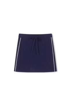 A straight-cut mini skirt in a soft linen–cotton knit with contrast side stripes and ribbed waistband. Lightweight and breathable for everyday warm-weather ease.