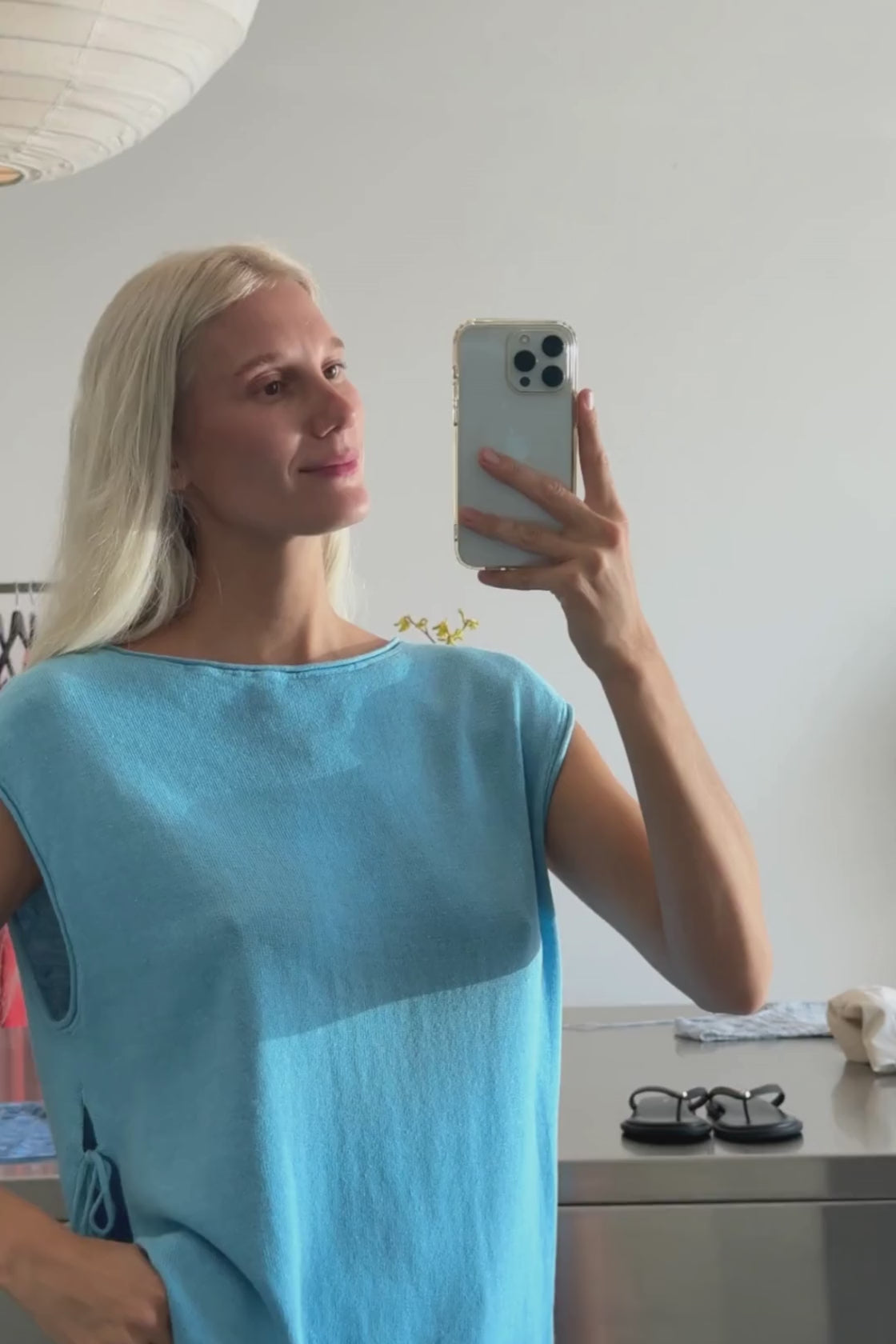 A lightweight, oversized tank with a breezy shape and side tie detailing. The rolled edges and textured weave bring softness and structure in equal measure.
