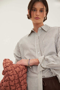 Oversized boyfriend-style shirt in soft 100% cotton stripe. Cut with a relaxed body, centre front button closure, oversized cuffs and an adjustable waist tie at the back to shape as you prefer. Light and breathable for warm days, workdays or travel, worn loose or cinched.