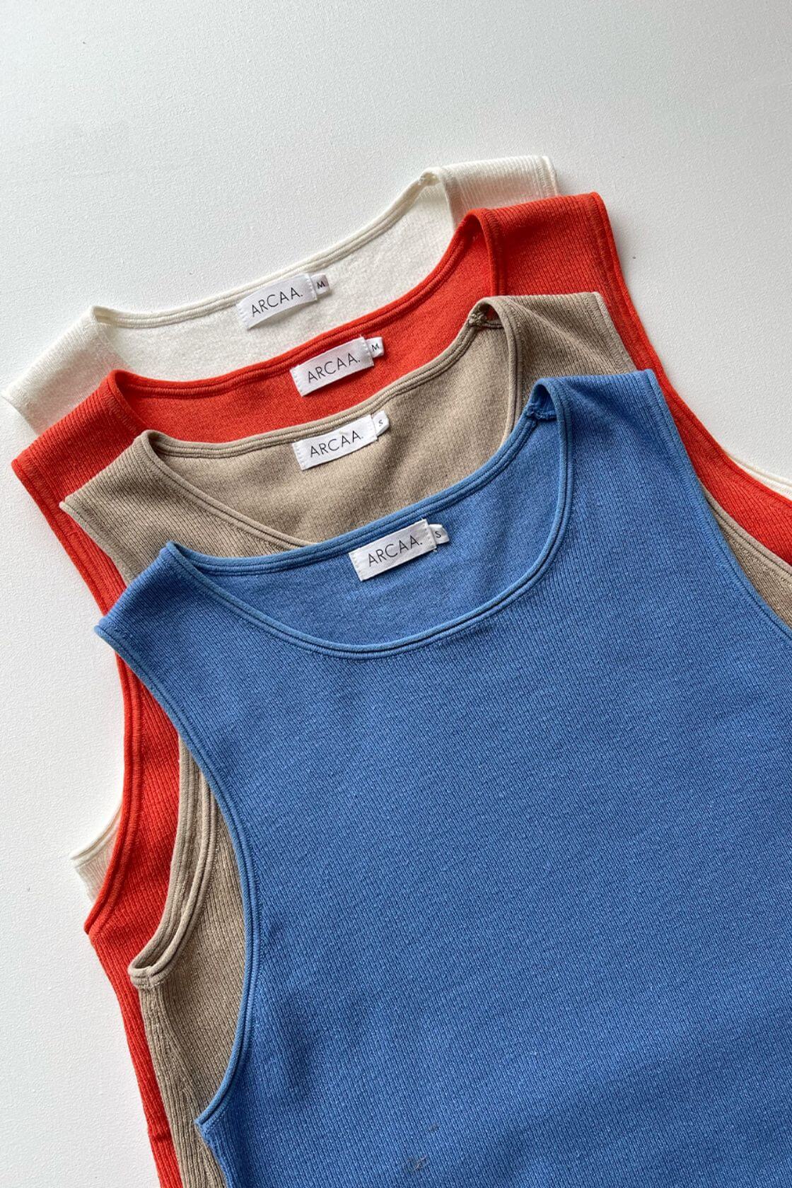 A soft, lightweight knit tank with a relaxed shape and flared hem. The Theo Tank features rolled edges at the neckline and arms for a natural finish. Designed for layering or wearing solo in warmer weather.